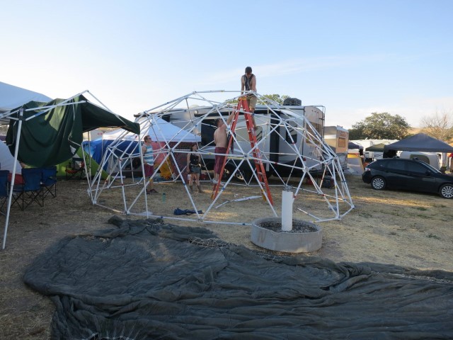 This past weekend we took it to a music festival in Southern California.  The additional 3 photos show the construction and finally putting a parachute over it to cover.  Unfortunately parachutes do not provide great UV protection - it got pretty warm inside during the hot day sun, so for our next trip we'll be rethinking the covering.